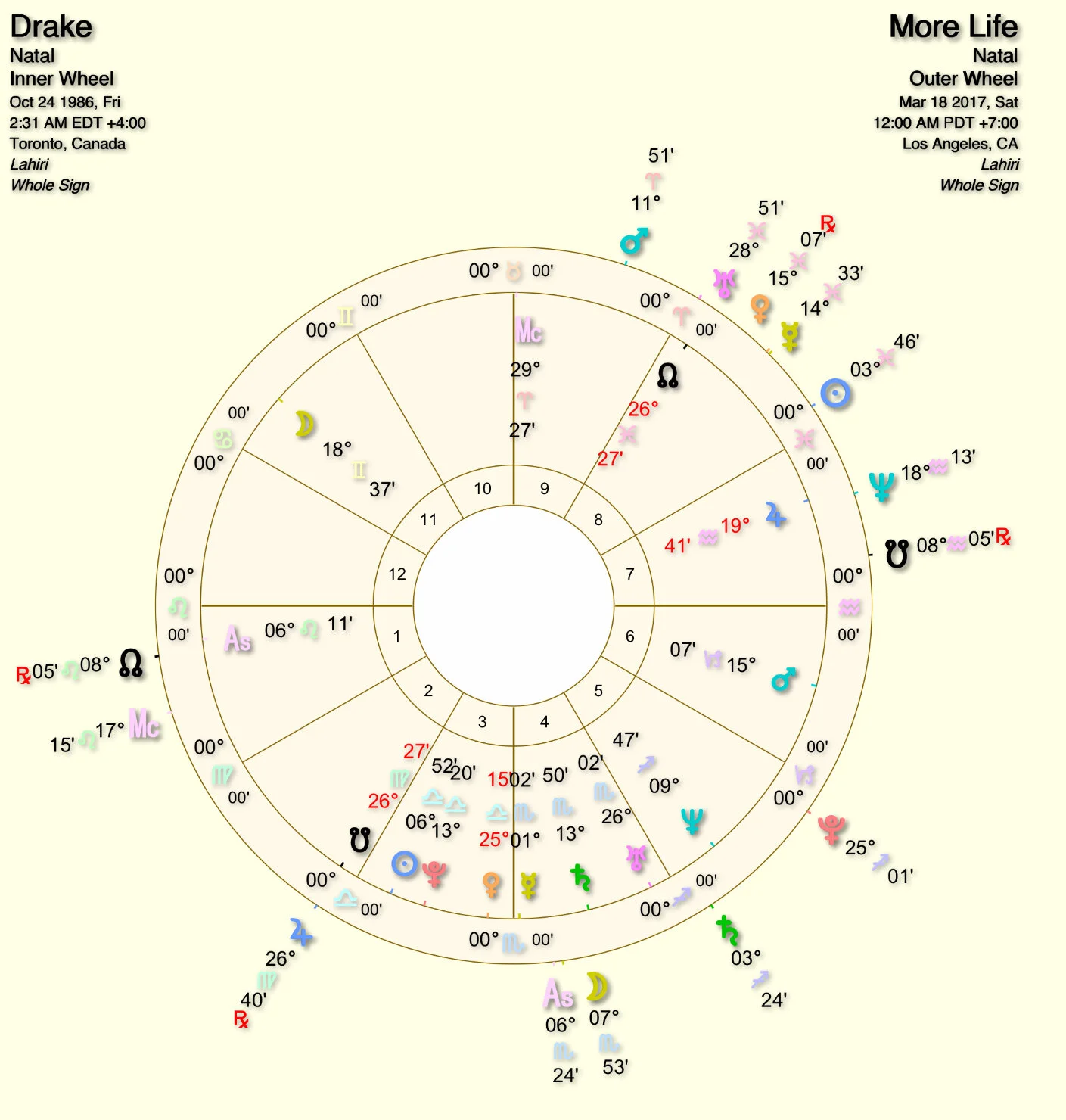 So this era is the exact reason why this 8H undoed the 7H quickly. This man had an album coming up during this haywire. His Rahu activated during this time, so this highlighted some of the exposing from Pusha T. BUT this was also the time he released God’s Plan and Nice for What. God’s Plan is sitting at over a Billion views, similar to Hotline Bling where Rahu was being activated by Neptune ruling his 8H in Modern Astrology. Now that this is the actual 8H year, we are getting a glimpse of this Rahuvian energy at its MAGNITUDE. This is why this stuff never stopped his career. Rahu has a way of only really feeding what you pay attention to. Drake paid more attention to what he wanted to feed, was his project. So, Rahu diverted this attention to what he cared about. He’s the ruler of his own chart. He said this was a high volume album, and that makes sense, because it was extra long! People commented on how long it was and tbh I felt like it could’ve been shorter, but I get what he was tryna do. This is also Rahuvian, doing the absolute most and taking it to the max. This is what brings me to another Rahuvian topic of his.